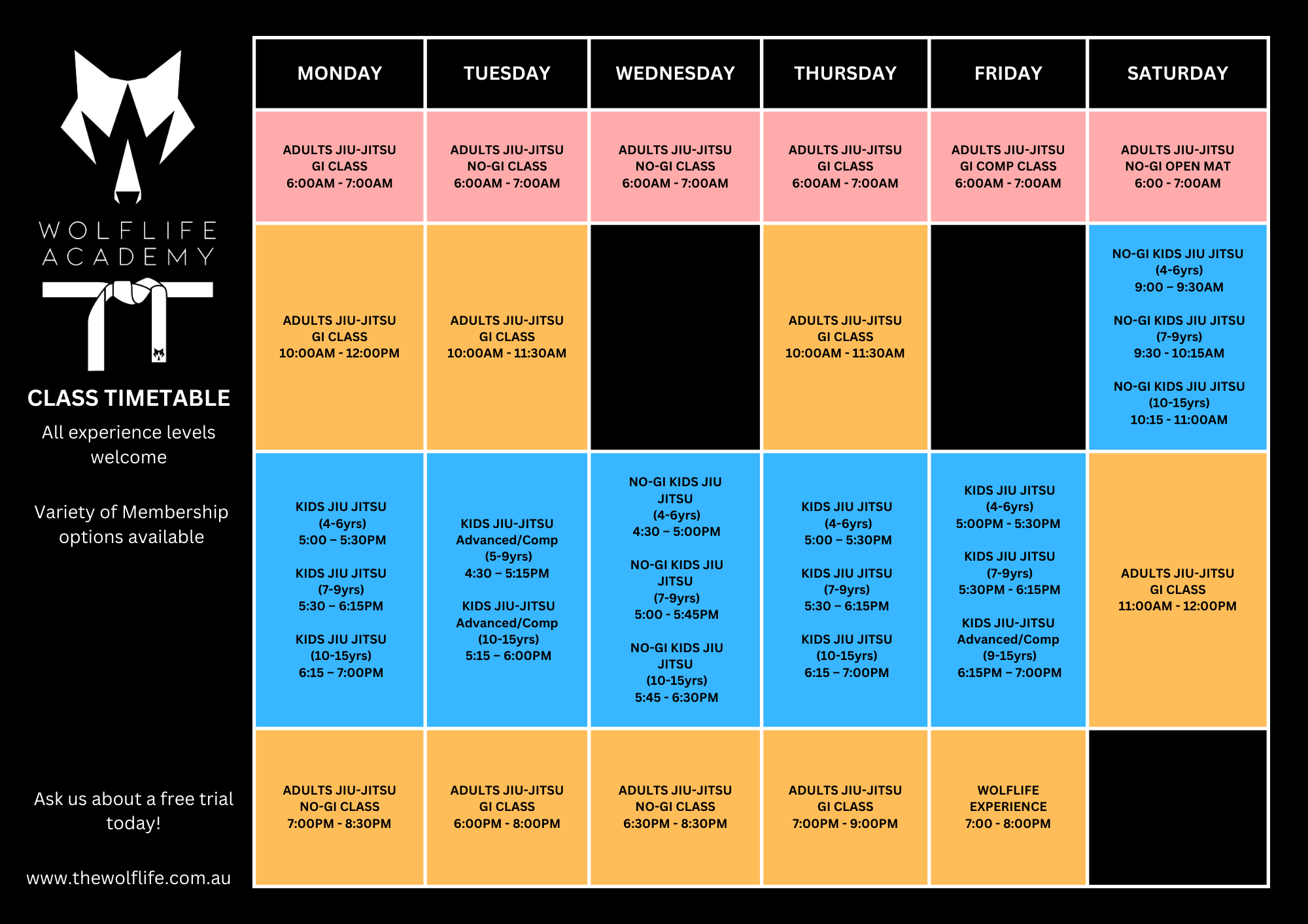 Gi and No-Gi Jiu Jitsu for adults of all levels and belts. We have early morning, mid morning and evening classes.